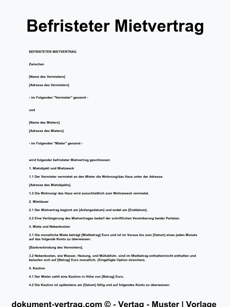 Wenn Sie einen befristeten Mietvertrag benötigen, sind Sie hier genau richtig! Es gibt zahlreiche Optionen, um eine Vorlage befristeter Mietvertrag kostenlos zu finden. Eine einfache Vorlage für einen befristeten Mietvertrag ist online verfügbar, ebenso wie die Mietvertrag befristet Vorlage Word. Der Befristeter Mietvertrag Vorlage Mieterbund bietet rechtliche Sicherheit. Für spezifische Bedürfnisse gibt es auch die Befristeter Mietvertrag Muster Haus und Grund oder für möblierte Wohnungen die Befristeter Mietvertrag möblierte Wohnung (PDF). Nutzen Sie diese Mietvertrag Vorlage befristet möbliert, um Ihre Mietverhältnisse sicher zu gestalten.