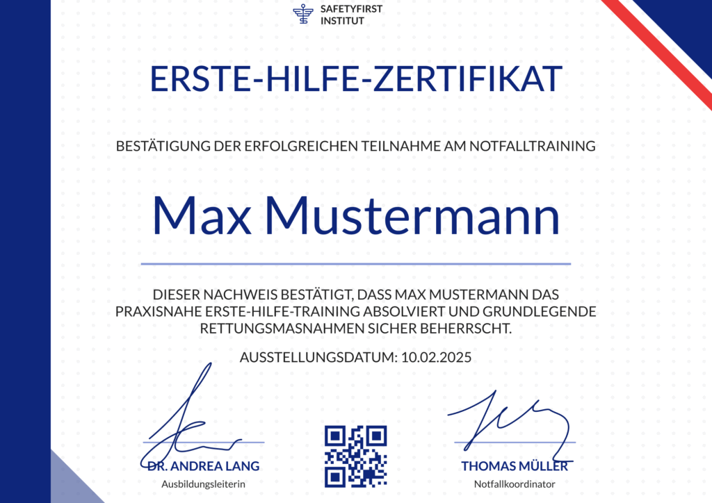 • Erste Hilfe Kurs Bescheinigung kaufen: Möglichkeit, eine gültige Bescheinigung zu erwerben, wenn der Kurs nicht persönlich absolviert werden kann oder bereits abgeschlossen wurde.