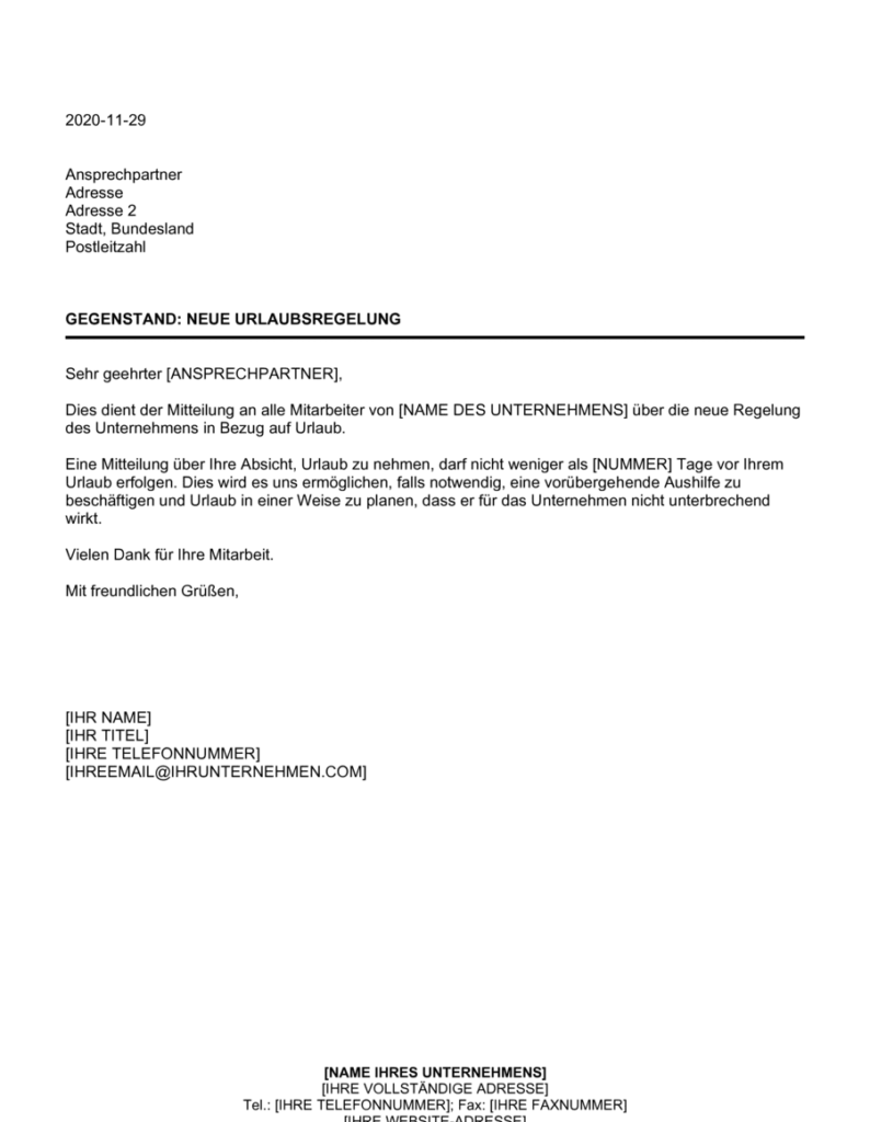 Geschäftswelt ist eine klare und professionelle Kommunikation unerlässlich. Insbesondere interne Mitteilungen spielen eine entscheidende Rolle, wenn es darum geht, Mitarbeiter über wichtige Informationen und Veränderungen im Unternehmen zu informieren. In diesem Artikel präsentieren wir Ihnen unsere umfassende Sammlung an internen Mitteilung Mustern, die speziell für Informationsschreiben an Mitarbeiter entwickelt wurden. Diese Vorlagen ermöglichen es Ihnen, Informationen effektiv und strukturiert zu kommunizieren, während Sie Zeit und Ressourcen sparen. Im weiteren Verlauf dieses Artikels haben Sie die Möglichkeit, unsere versatile Vorlage für das Informationsschreiben sowohl im PDF- als auch im DOC-Format herunterzuladen. So können Sie die Inhalte einfach anpassen und für Ihre individuellen Bedürfnisse nutzen. Schaffen Sie eine klare Kommunikation mit unseren praxiserprobten Vorlagen.