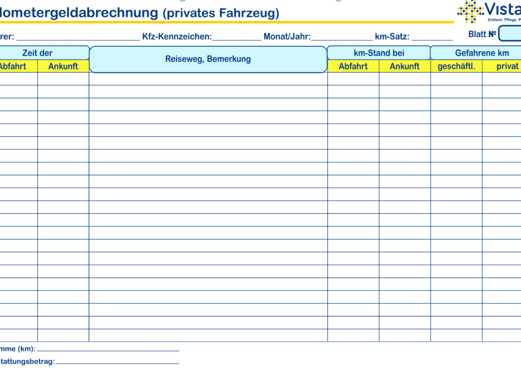 Sie benötigen das Datum, den gefahrenen Ort, die Anzahl der Kilometer und den Erstattungssatz pro Kilometer.