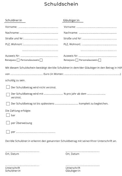 Kostenloses Musterschuldschein zum Ausdrucken: Privat Geld verleihen und herunterladen